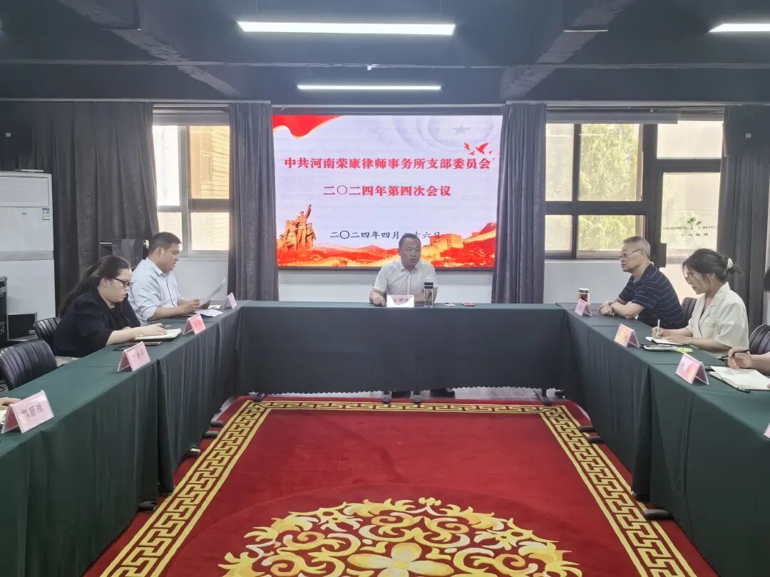 2024年4月26日下午中共河南荣康律师事务所党支部(荣康党支部)在三楼会议室召开荣康党支部四月份支部会议,全体党员参加,副主任卢东海、贾亚豪及部分律师列席会议,会议由荣康党支部副书记王明伟主持。